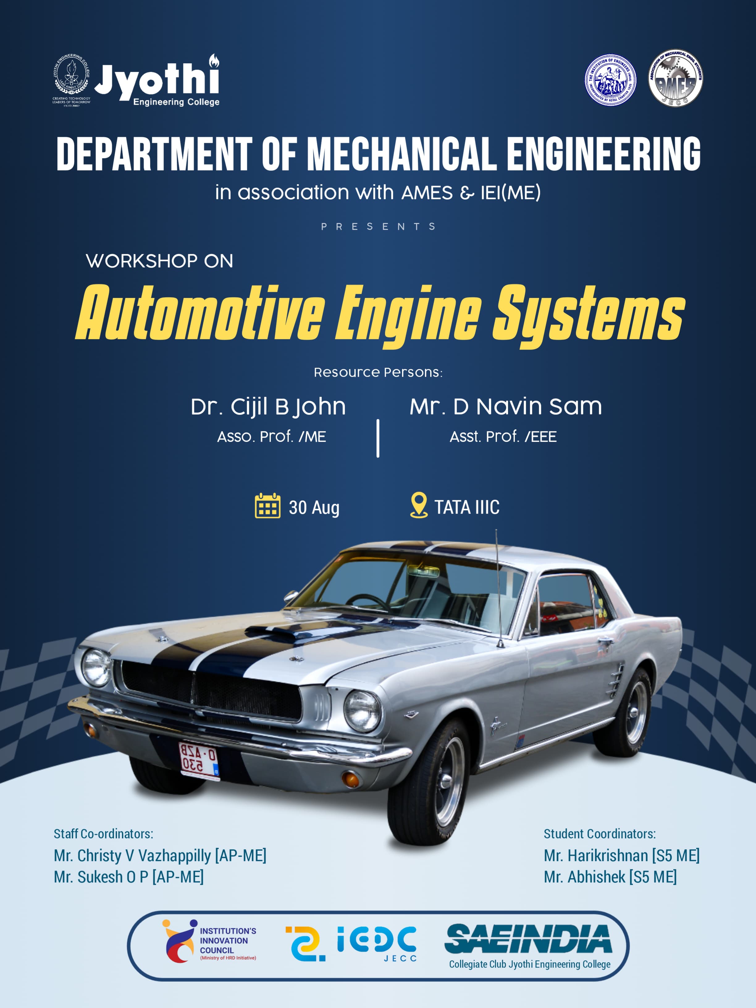 The IE(I) - ME Chapter, JECC, successfully organized a one-day workshop on "Automotive Engine Systems" on 30th August 2024. The event was held at TATA IIIC, JECC, and witnessed enthusiastic participation from 42 third-year Mechanical Engineering students. The workshop aimed to provide an in-depth understanding of various automotive engine systems and their practical applications. The resource persons for the workshop were Dr. Cijil B. John, Associate Professor - ME, JECC, and Mr. D. Navin Sam, Assistant Professor, EEE-JECC. Both speakers brought their expertise and experience to the session, ensuring a comprehensive learning experience for the attendees. The workshop included detailed explanations and hands-on training on several key automotive engine systems, including: Starting System Ignition System Fuel Injection System Cooling System Air Conditioning System Power Transmission System Fuel Supply System Engine Exhaust System The interactive nature of the session allowed students to gain practical insights into the functioning and integration of these systems within modern automotive engineering. The hands-on activities were particularly engaging, enabling students to connect theoretical knowledge with real-world applications. The feedback from the students was overwhelmingly positive. They appreciated the practical approach and the clarity with which the topics were presented. Many highlighted the relevance of the workshop in bridging the gap between academic learning and industry practices. The workshop concluded with a vote of thanks, acknowledging the efforts of the resource persons, organizers, and participants for making the event a success. The session proved to be highly informative and beneficial, further inspiring students to explore advancements in automotive engineering.